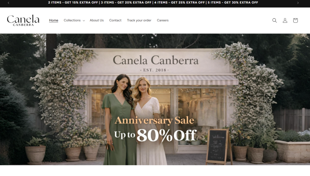 CanelaCanberra.com is presented as an online retail store offering a wide range of products at discounted prices. Like many emerging e-commerce platforms, it relies heavily on visual appeal and pricing strategies to attract buyers.
