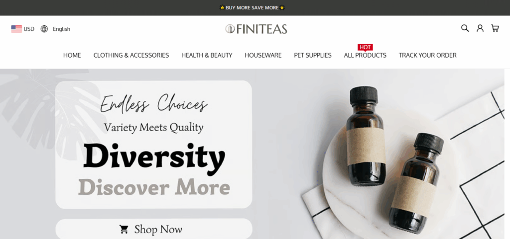 Finiteas.com is an e‑commerce store that claims to sell a broad range of products, including beauty & skincare, clothing, pet supplies, and household items. Their website features typical retail content: a “Best Selling” section, a “Track Your Order” page, and legal pages like Privacy Policy, Return Policy, and Terms of Service. finiteas