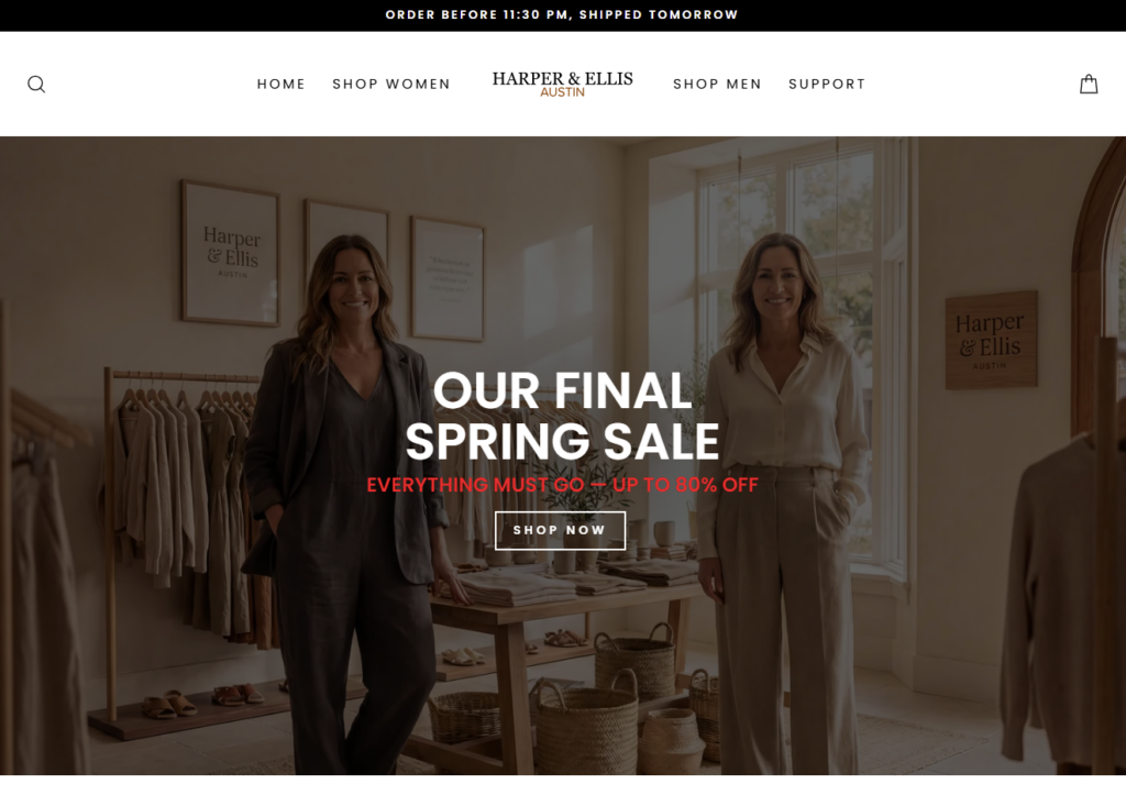 Harperandellis-austin.com is an online fashion store that claims to sell clothing, footwear, and accessories for men and women. The platform uses modern website design, promotional pricing, and seasonal sales to attract shoppers.