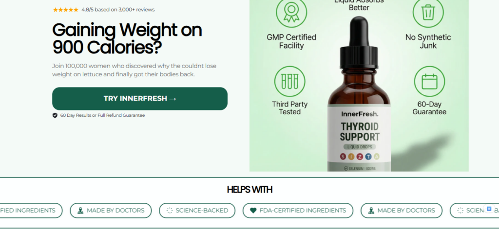 Innerfresh Thyroid Support appears to be a supplement marketed to support metabolism, energy, and overall thyroid function. Consumer reviews on sites like Trustpilot suggest users are trying the product and sharing experiences, but there isn’t a large amount of independent clinical information available yet. According to recent user reviews, some report positive effects like reduced bloating and increased energy when taking Innerfresh products, along with weight changes — though results vary by individual.