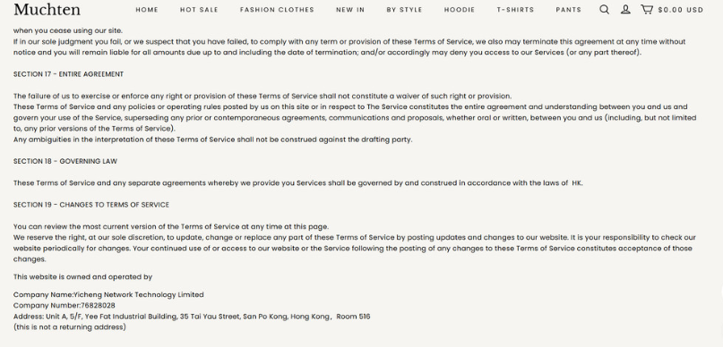 The website’s Terms of Service and Privacy Policy appear to be copied from other sites, which is a common tactic used by scam stores.