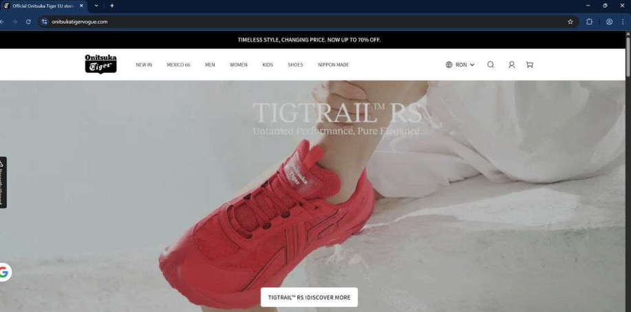 Onitsukatigervogue.com presents itself as an official Onitsuka Tiger store, offering shoes at heavily reduced prices. At first glance, the site appears professional, but deeper research reveals multiple signs of a scam.