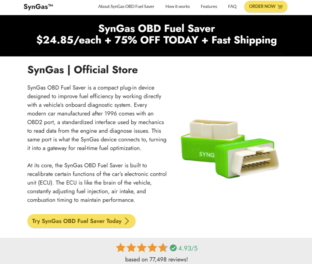 The SynGas Fuel Saver sits in a crowded category of OBD plug-in fuel optimization devices that promise efficiency gains without mechanical upgrades.
